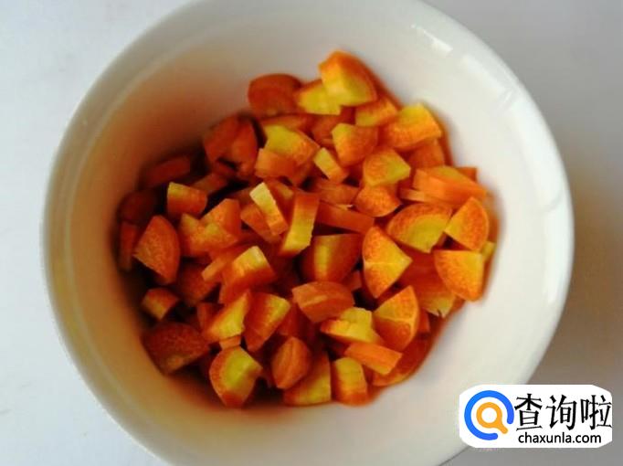取一根新鲜的胡萝卜,用清水把胡萝卜洗净,放在菜板上,把胡萝卜切丁待用,大家都知道,胡萝卜营养丰富,特别对我们的视力有好处,现在成天玩电脑看手机,多吃胡萝卜对我们有益。