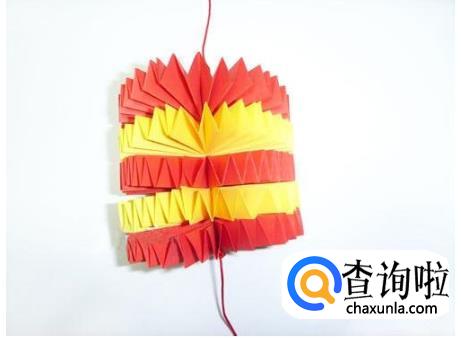 贴两张长条系在绳子上装饰一下,如图,这样灯笼就做好了。