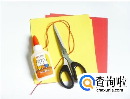 准备材料:彩纸,剪刀,胶棒,绳子,打孔机。
