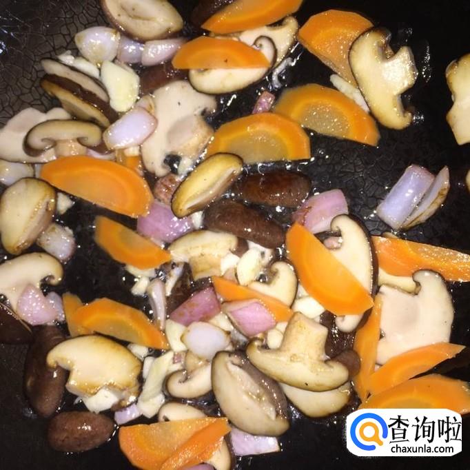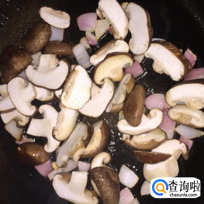 再起一锅,加入适量的食用油,将洋葱下入锅里,翻炒几下,炒出香味;将香菇下入锅里,将火调小,将香菇慢慢炒熟;
