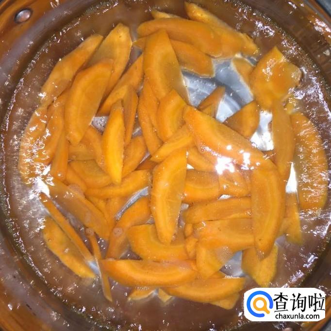 将胡萝卜放入锅里,加适量的水(能够将胡萝卜淹没再稍多一点点即可),煮开后再煮1-2分钟,让胡萝卜九成熟;将胡萝卜捞出,沥干水分;