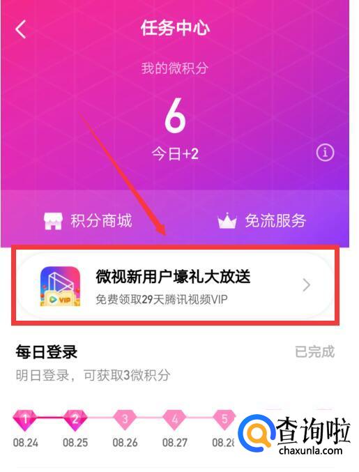 进入任务中心界面后,点击“微视新用户壕礼大放送”,后按照页面提示即可免费获得腾讯视频会员了。