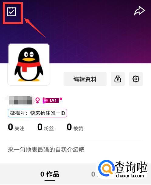 打开微视,登录后进入到我的界面,点击页面左上角的任务图标(如下图红框处所示)。
