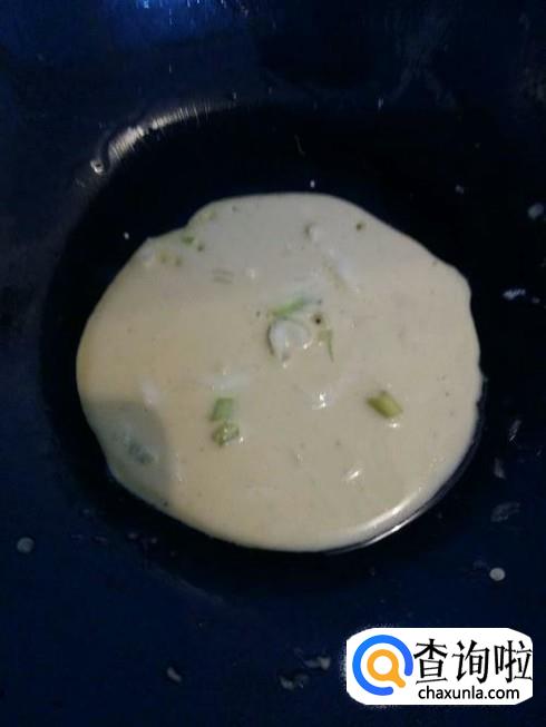 锅中放入适量的植物油,烧热。用勺子舀一勺面糊,放入锅中,用铲子将其摊开,使其小火煎炸。