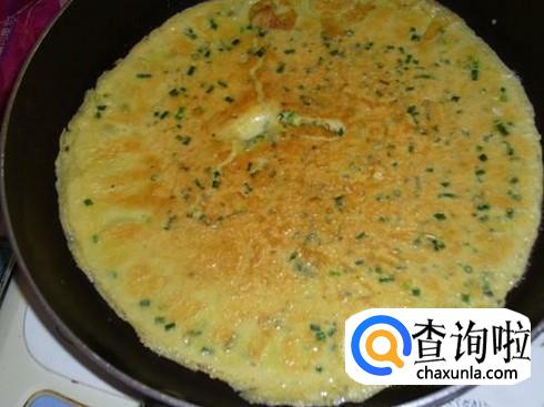 待锅中的面糊形成面饼状,将面饼翻过来,煎炸另一面,直至将面饼炸成两面金黄,即可盛出。