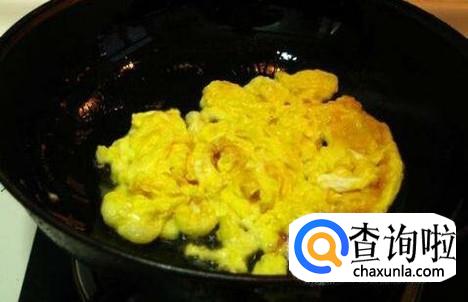 将碗中的鸡蛋液倒入锅中,轻轻翻动,使其成型结块,形成鸡蛋快。