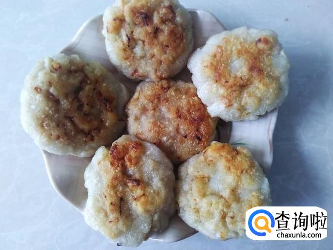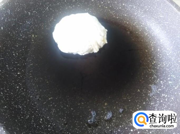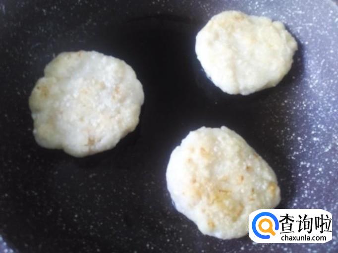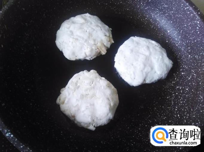 开火下油,用手抓适量的粉团揉压成小饼状,然后放置锅里用小火煎。