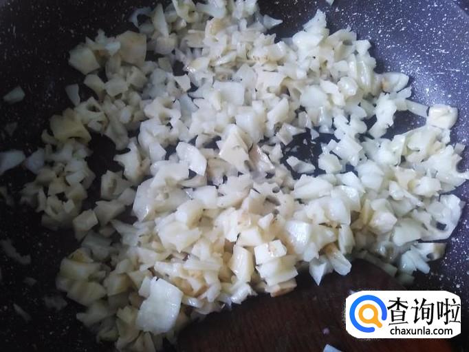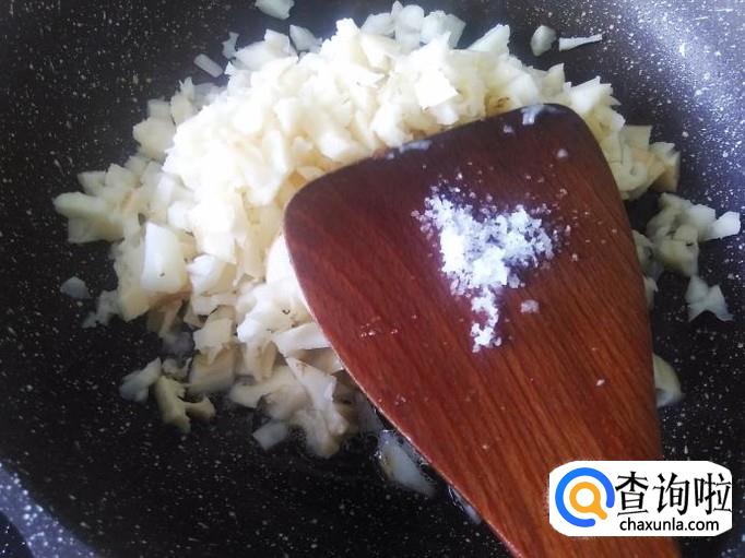 开火下油,放莲藕碎进去加适量的盐翻炒。