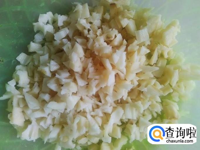 首先把莲藕清洗干净去皮,然后剁成碎丁。