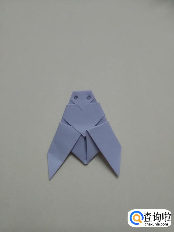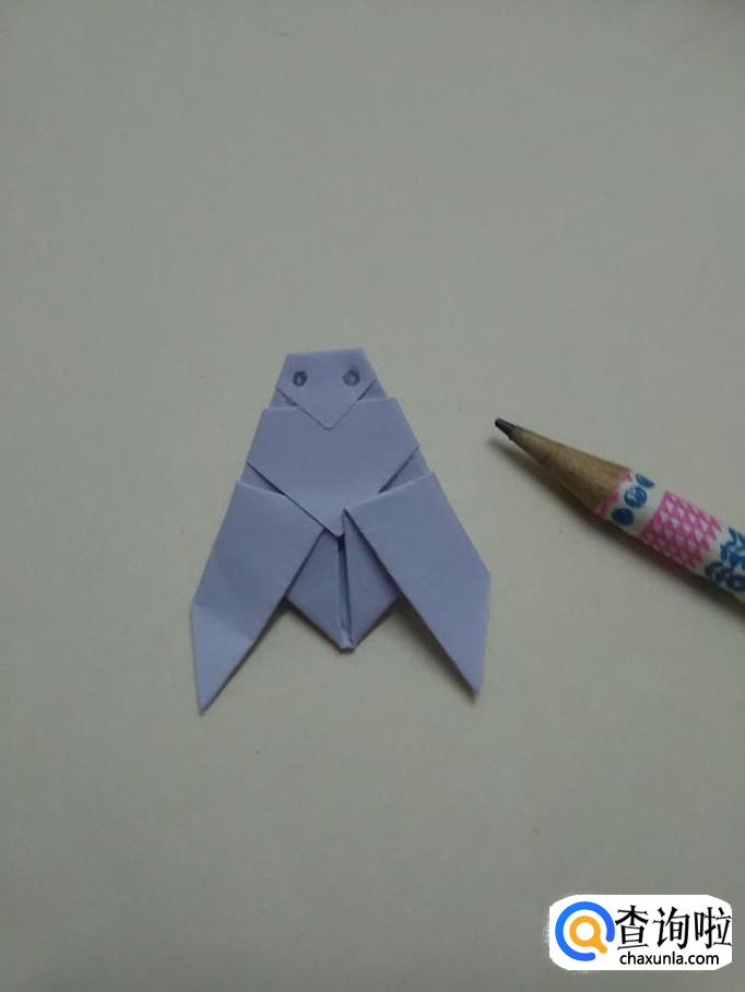 把纸再反过来,用铅笔在头上画两个点,当作眼睛,知了就折完了。