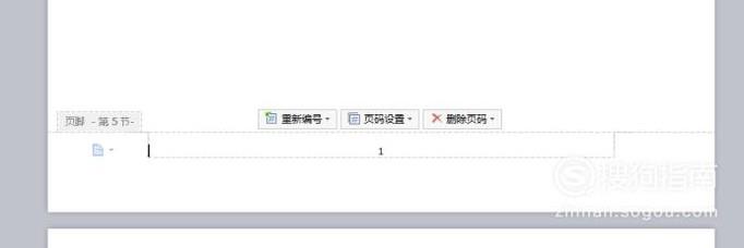 如果我们想把第五页文档,设置成开始第一页,这时候要找到第5页文档的页码“5”处,就会出现“重新编号”“页码设置”“删除页码”三个选项