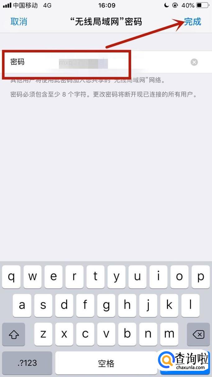 最后输入你的密码并点击完成。这样设置完成,电脑或手机搜索到我们的WiFi只要输入正确的密码就能够分享我们手机中的流量了。你学会了吗?赶快动手试一试吧。