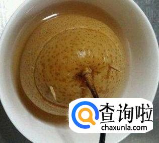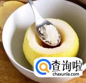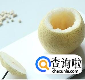 将泡好的川贝与冰糖同等比例混合后放入去核的雪梨中,再将雪梨顶盖上。