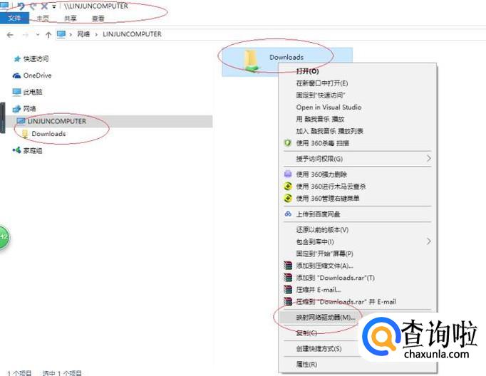 打开"文件资源管理器"程序窗口,如图所示。鼠标右击"此电脑→网络→Downloads"文件夹,弹出快捷菜单选择"映射网络驱动器..."项。