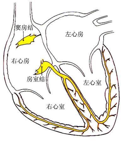 结构特点由围绕在窦房结动脉周围细小肌纤维的主体构成。这些细小的肌纤维聚集成葡萄状,散在于致密胶原纤维编织成的网状结构的支架中。窦房结内有P细胞、移行细胞或称过渡细胞、普通心肌细胞和浦肯野细胞等4种细胞。结内尚有交感和副交感神经纤维分布。窦房结内的各型细胞,多数具有浦肯野纤维的特征。较小的窦房结细胞互相交织,并且可与某些大型的浦肯野细胞相延续。大部分浦肯野细胞和较小的结细胞构成离开窦房结的纤维束,进入心房参与结间束的组成。结细胞主要位于结的中央部色,苍白,因其具有起搏作用,是起搏细胞,又称P细胞。生理学表明,结细胞是起搏冲动的发生部位。结细胞外周的移行细胞,连接于结细胞与一般心肌细胞之间。现认为移行细胞是窦房结内的传导细胞。正常时,窦房结在心脏组织中自律性最高。因此,心跳的节律受窦房结控制,由窦房结发出的冲动所形成的心脏搏动,称为窦性心律。心肌细胞具有传导性,窦房结的传导性较慢,从而有其特殊的自我保护的特点。即能使结细胞产生的电脉冲易于从结细胞簇外传,但阻止其他刺激信号进入结细胞群,从而可使窦房结的功能不易被外来的信号所干扰,以保持其自律性的稳定。由于窦房结动脉不成比例地粗大,并穿经窦房结中央,窦房结发放冲动的频率,可能受窦房结动脉搏动刺激的调节。每次心脏收缩,血液进入冠状动脉的同时,窦房结动脉的口径和管径内血流速度,亦有时有相应地改变,牵拉结内的胶原纤维网,刺激网眼内的结细胞群,以影响和调节结细胞的放电频率。