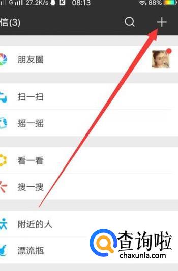 打开手机微信,进入之后,点击图示位置的“+”,如图所示。