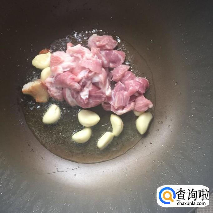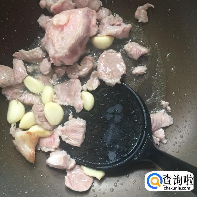 接着把瘦肉切成肉片倒入锅中,翻炒三分钟。