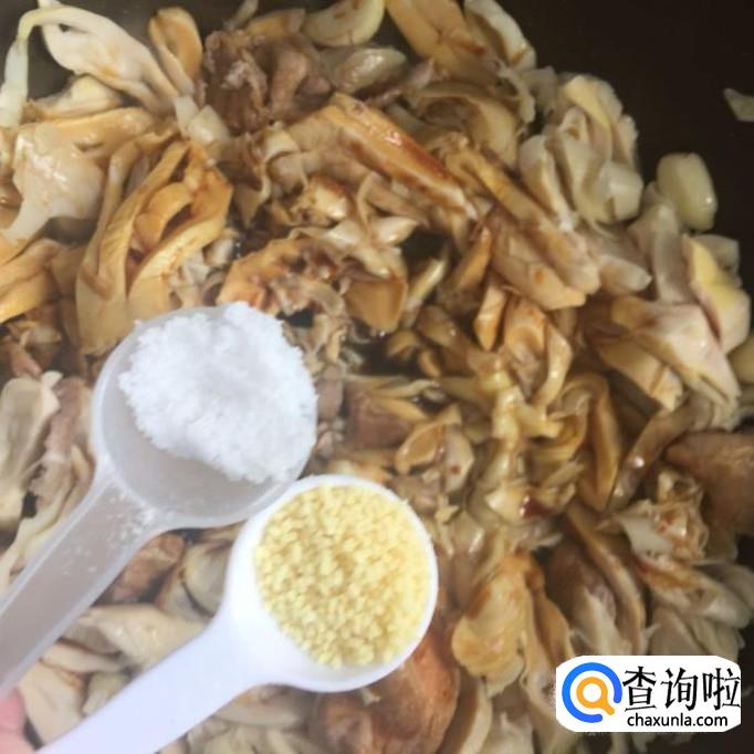 接着往锅中加入适量的酱油,一勺的盐巴和一勺的味精,翻炒两分钟。