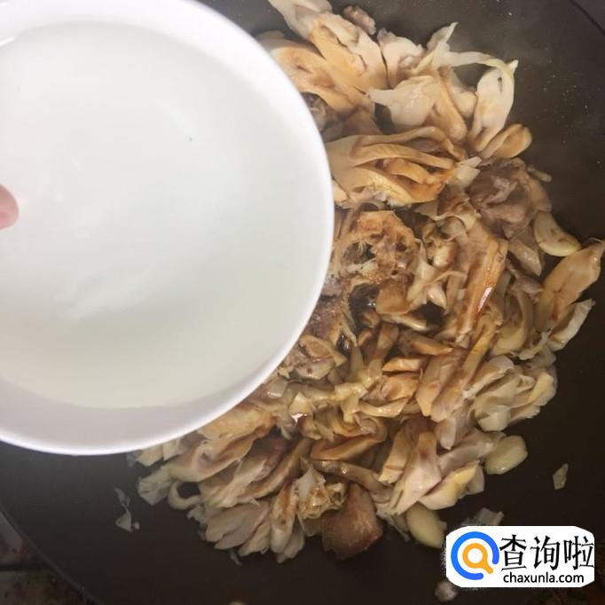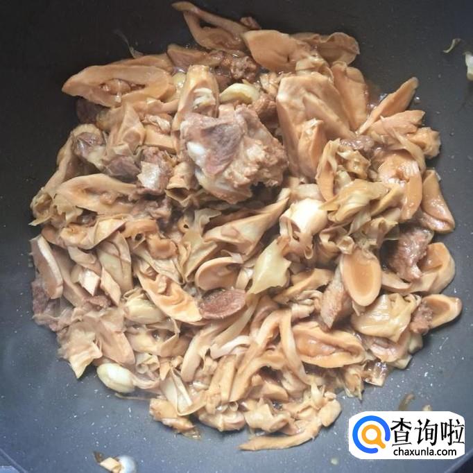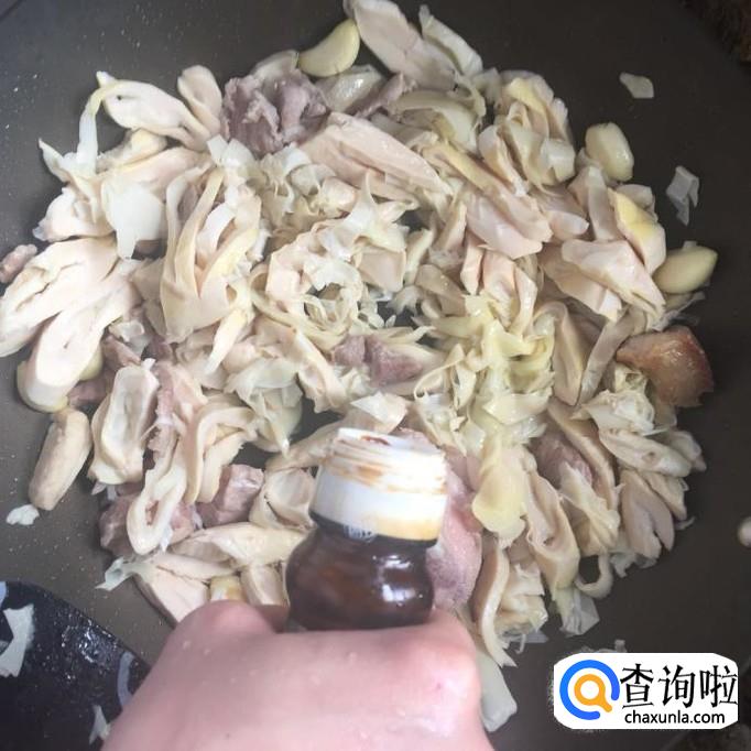 然后把笋干切成薄片,倒入锅中翻炒五分钟。