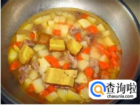土豆煮好之后,拿出咖喱加进去一两勺,然后加上食盐调味,汤汁渐浓的时候就可以出锅了。