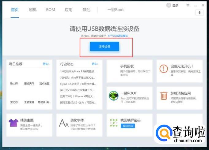 接下来,使用数据线连接软件与手机,此过程需要开启系统USB调试模式,如果之前已经开启的话,此时就可以顺利连接。