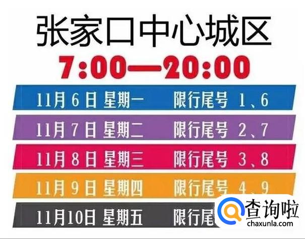 张家口市实行每天限行2位尾号的机动车,周一限行1和6,周二2和7,周三3和8,周四4和9,周五5和0,含临时号牌,尾号为英文字母的以倒数第一位阿拉伯数字为准。