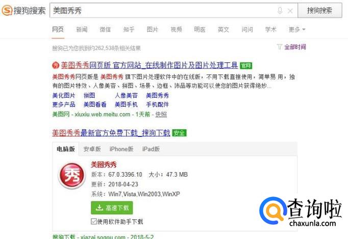打开搜狗搜索,搜索美图秀秀,将其下载安装到电脑上边,如图所示。