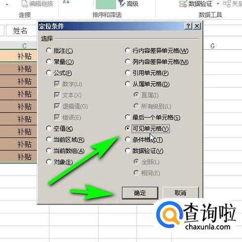 在弹出的定位条件对话框中,选择:可见单元格;再点确定。