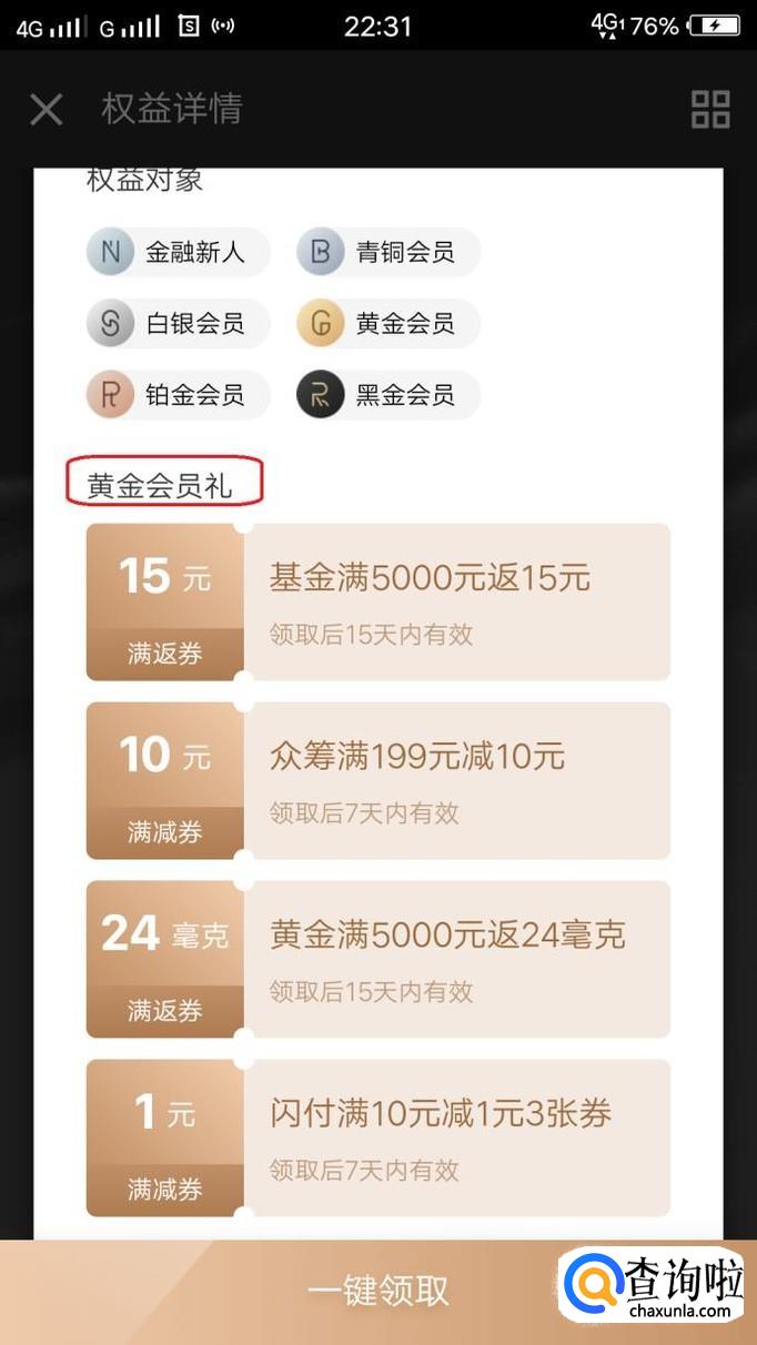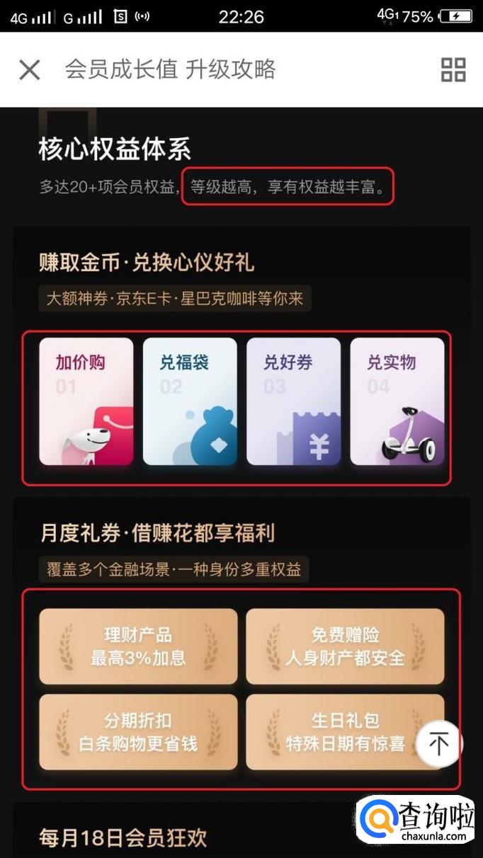 我们看到,目前京东金融共有5个等级,其中,铂金会员排行第2,需要达到10000成长值。往下划动,就能看到会员权益了。