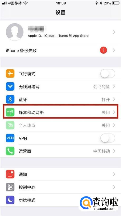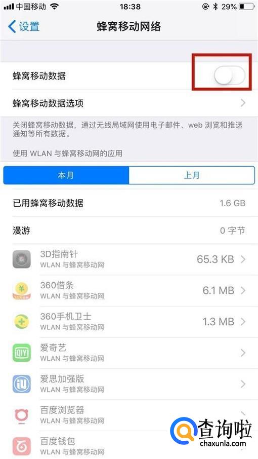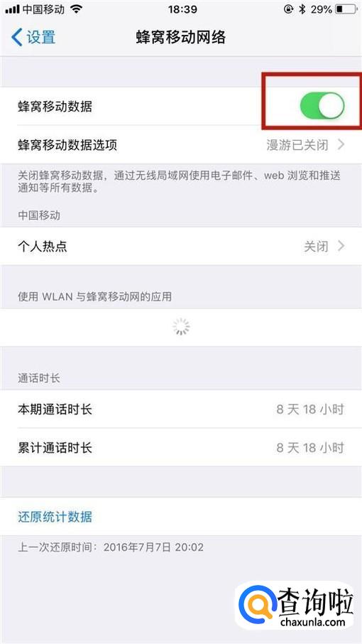 接着点击开启蜂窝移动数据开关,如下图所示。
