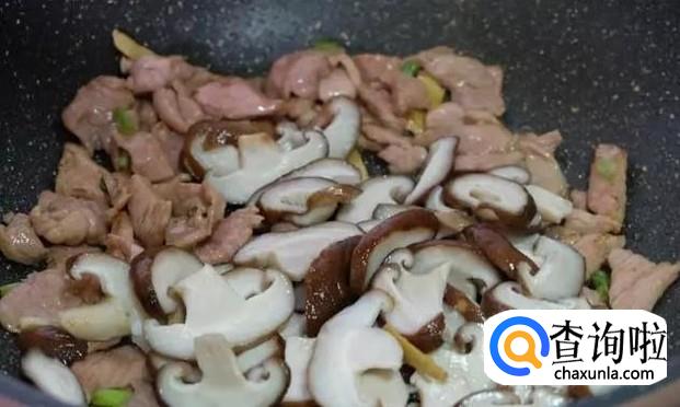 等到肉变色以后,将准备好的香菇放进锅里进行翻炒,如下图所示