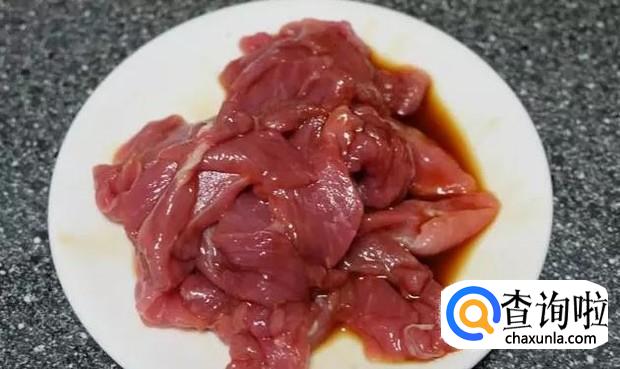 接下来我们将猪肉切成片,然后往猪肉上撒一些酱油,如下图所示