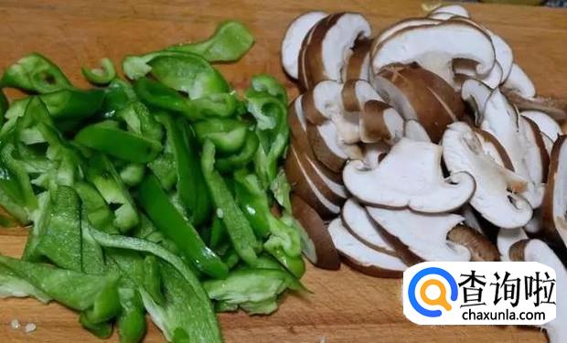 接下来就需要切青椒和香菇了,青椒的话切成细块即可,香菇的话可以切成片状的,如下图所示