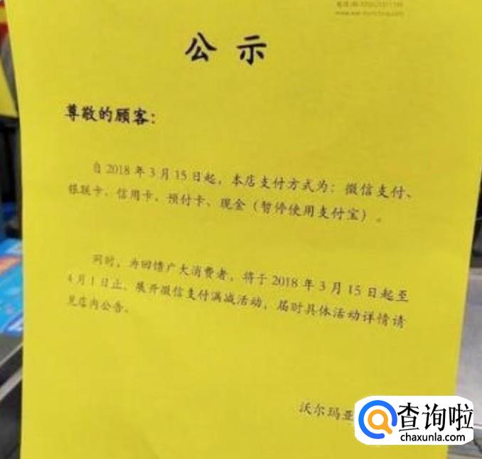 在沃尔玛超市看到禁用支付宝的告示,并且还开展了微信支付满减的活动.显而易见,这分明是针对支付宝的做法.