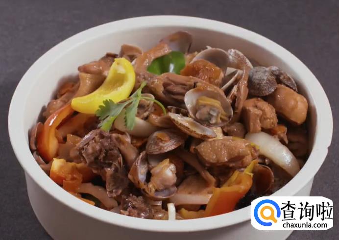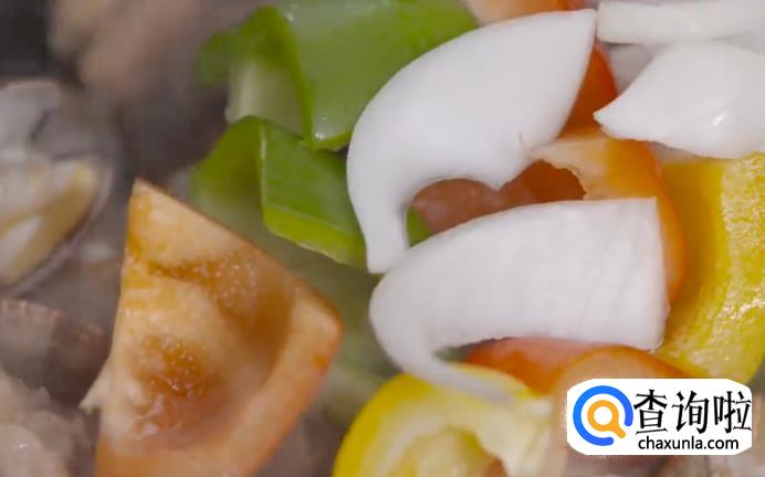 焖煮入味后倒入蛤蜊,大火爆炒至蛤蜊开口后加入彩椒和洋葱。