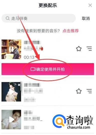 以走马为例,搜索走马伴奏,在搜索结果中点击一个伴奏,选择“确定使用并开拍”后,在唱歌的时候就会有伴奏了。