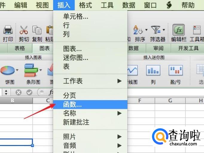 点击菜单上的插入,并点击函数。
