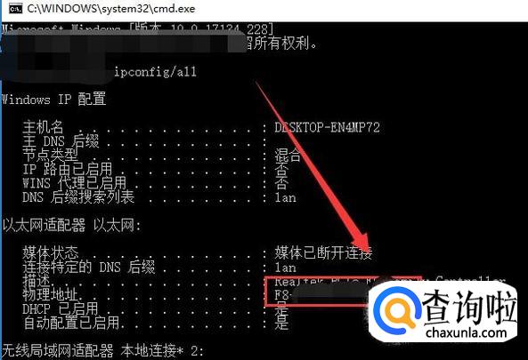 按完回车之后,就会出现电脑网卡物理mac地址,如图所示。