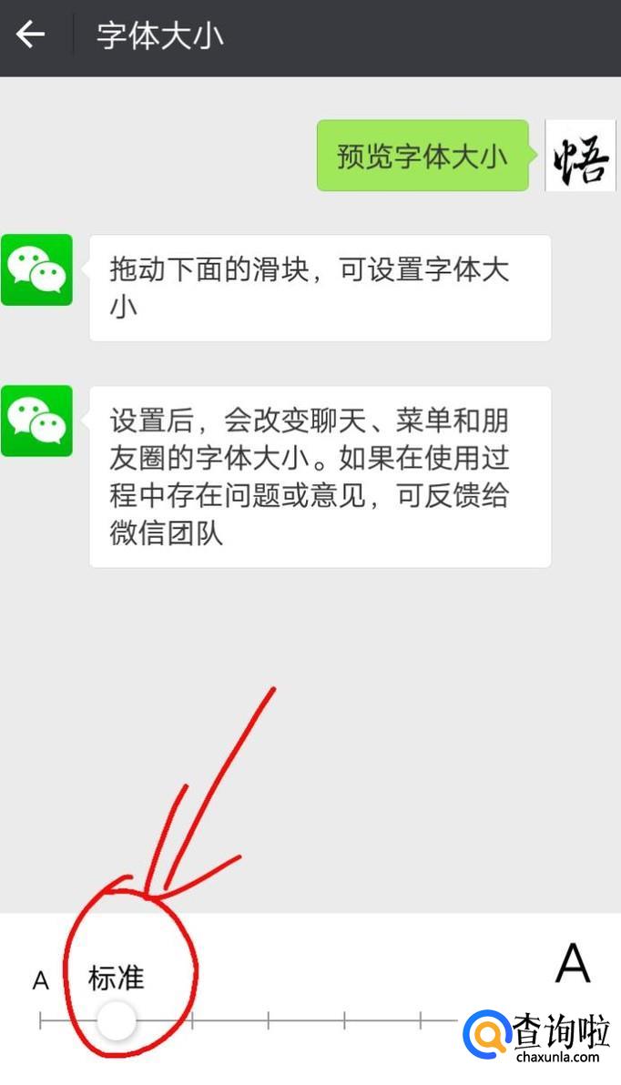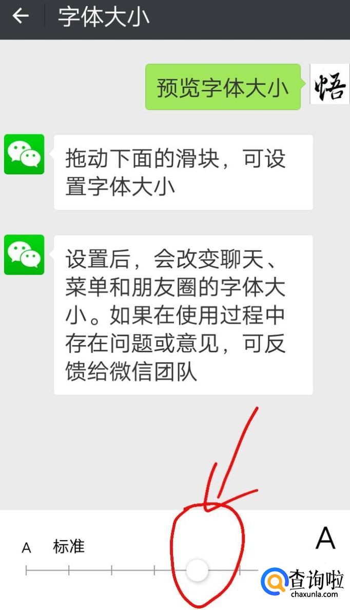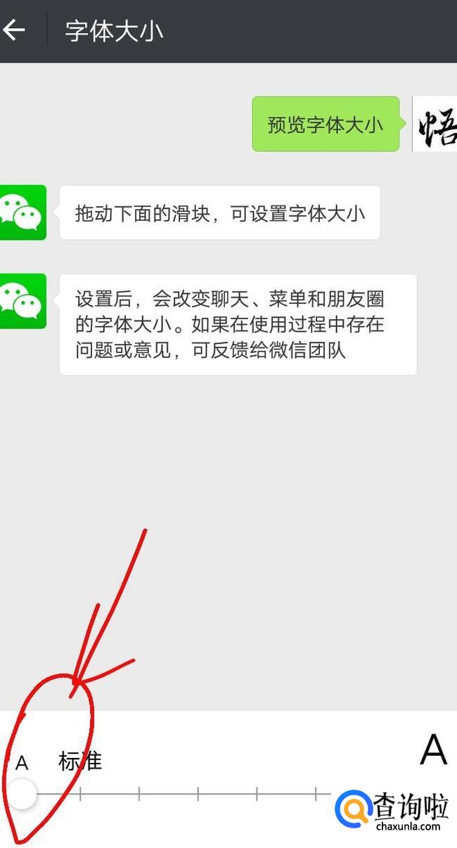 此时我们看到的字体是标准状态,滑动所圈按钮,向左滑动字体变小,按右滑动字体变大。当然字体大小的选择因人而异。