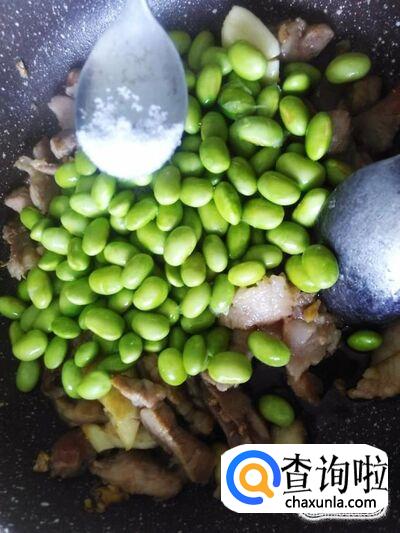 青豆下锅,加适量的盐翻炒20秒左右,洒点水花,盖上盖子焖到水份干完。
