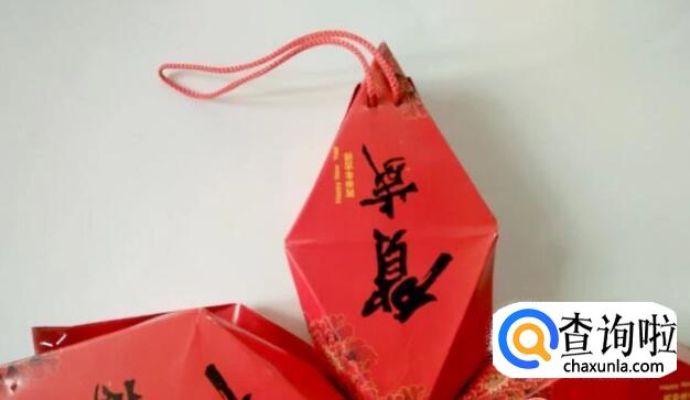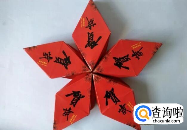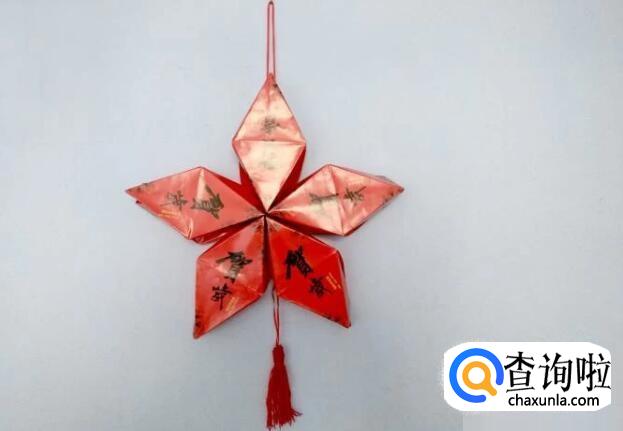 最后把穗头用订书器钉在与上面红绳一条线的红包上,五角形灯笼就做好 了。