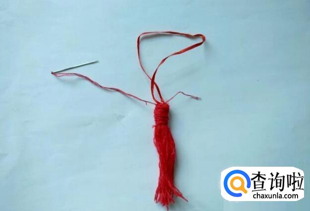 用针线将另一条粗红绳缝在穗头头部的中间。