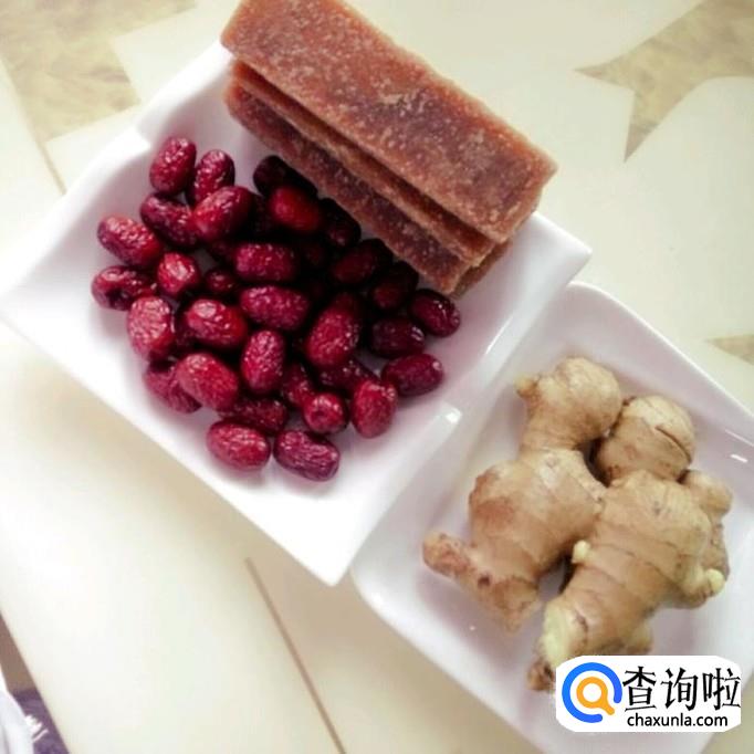 挑选老姜,洗干净沥干切成片备用,红枣洗干净晾干,去核备用,红糖准备好。