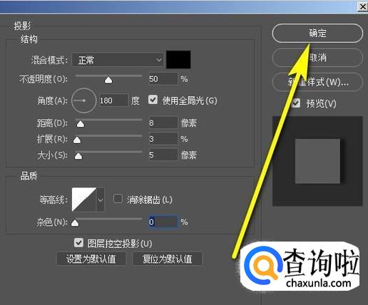 其它的选项按默认的,在面板右上角点击:确定。那么,这个圆角矩形的投影效果就设置完成啦。