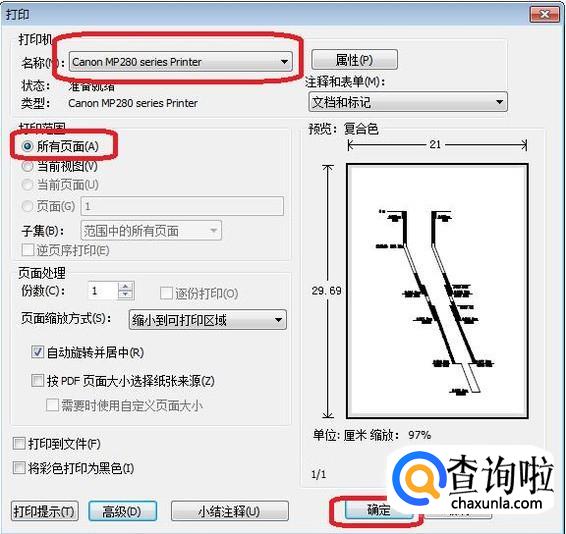 然后打开PDF图形,点击“文件”,“打印”,弹出“打印”选项框,因为图形都设置好了,选择打印机,直接点击“确定”就可以打印出图了。