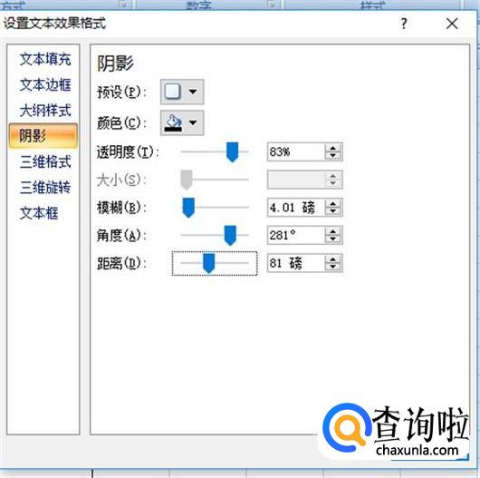 点击打开设置文字效果格式可以设置水印的阴影,透明度和旋转,见下图
