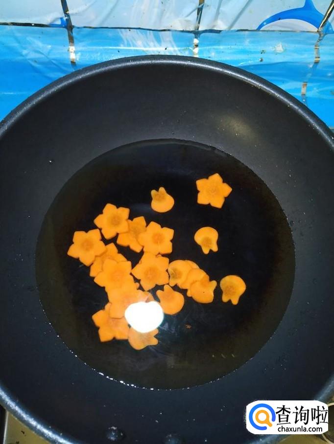 锅中放入适量清水,然后将刻好的胡萝卜放入锅中。