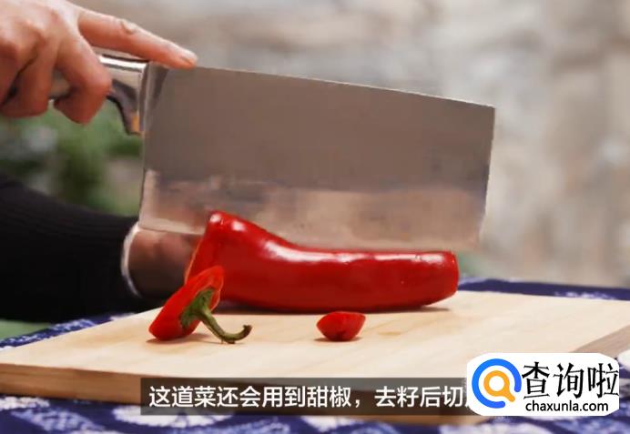 将甜椒去籽后,切成小块。