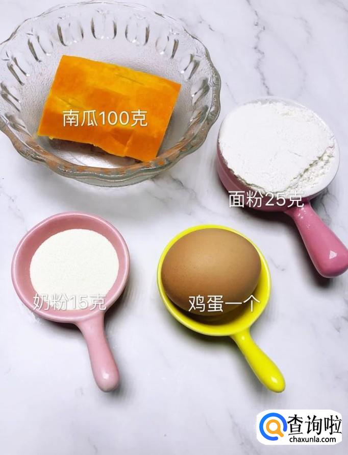 首先准备好所有要用的食材,如下图所示。小贴士:南瓜100克。面粉25克,鸡蛋一个,奶粉15克。