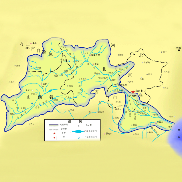 永定河发源于山西省宁武县管涔山,全河流经山西、内蒙古、河北、北京、天津五省市,在天津汇于海河,至塘沽注入渤海。